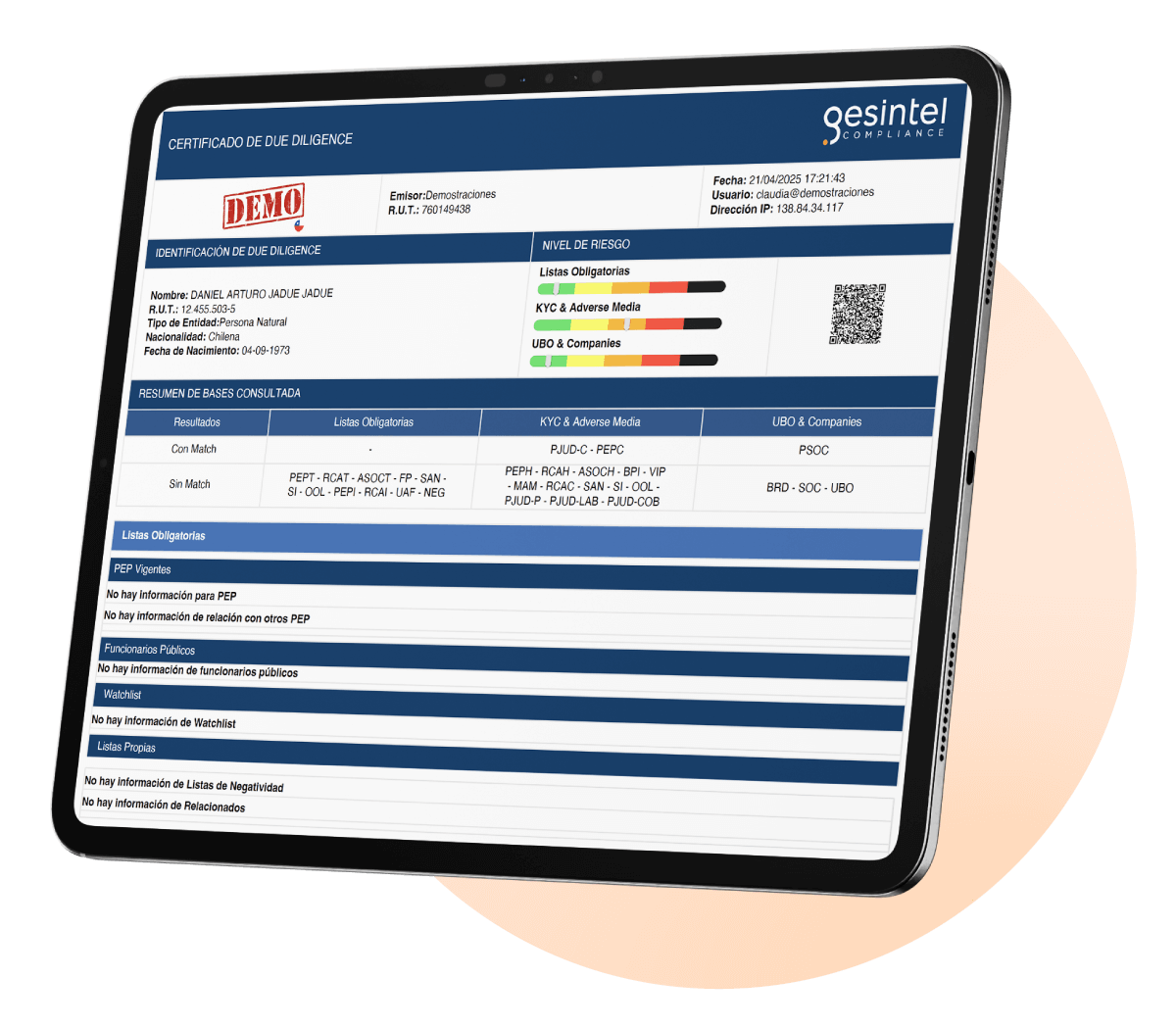 Entregamos un reporte de tus stakeholders para determinar el nivel de riesgo de la empresa al relacionarse con ellos. Se realiza un cruce con todas las bases de Compliance de Gesintel.